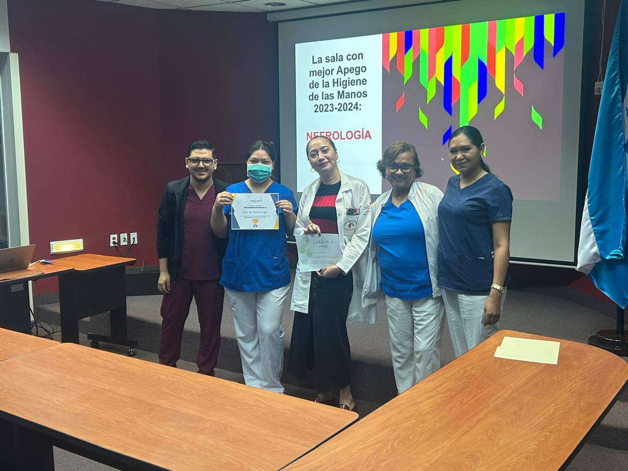 Durante el evento, se reconoció al equipo de la sala de Nefrología por su excepcional cumplimiento de las medidas de higiene, destacando su dedicación y esfuerzo en mantener un entorno seguro para los pacientes.